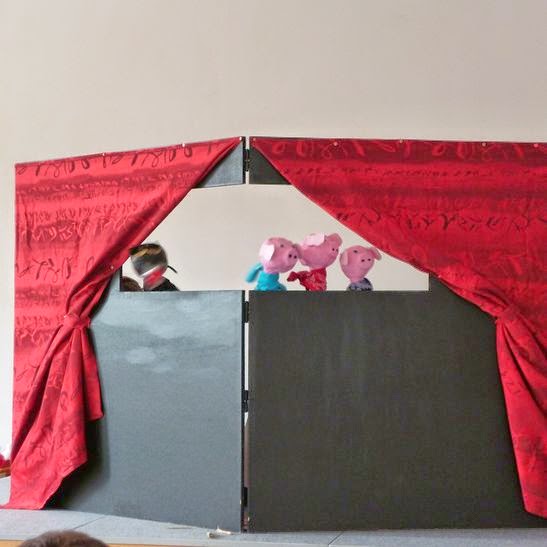 Chloé, Coralie et Ludivine aidées de Maylis ont donc présenté aux enfants une piécette de marionnettes « Les 3 petits cochons ».